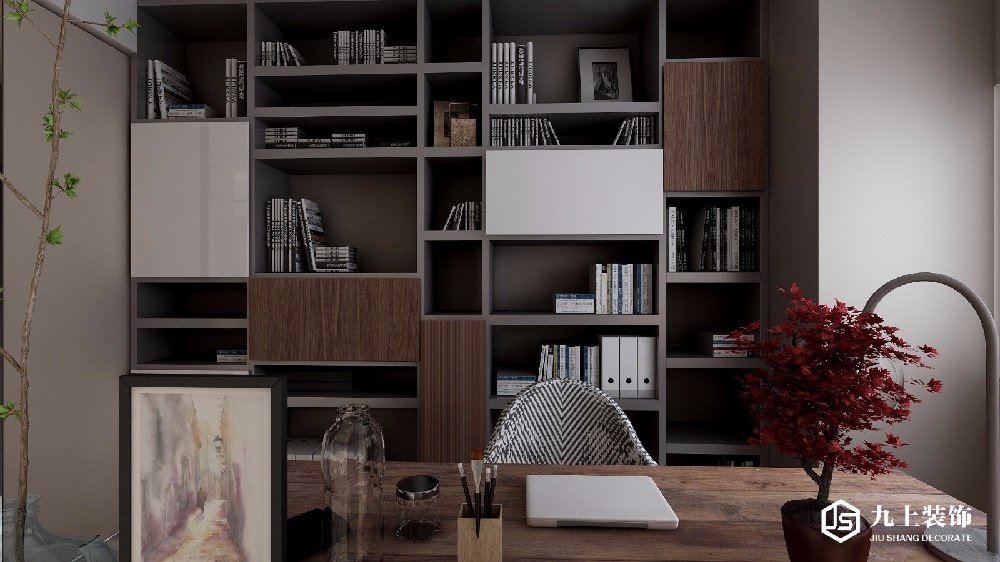 書(shū)房選擇比較有意境的古典風(fēng)格,顏色偏深,搭配富有意境的盆栽。玻璃墻體,有讓書(shū)房不會(huì)顯得過(guò)于壓抑。