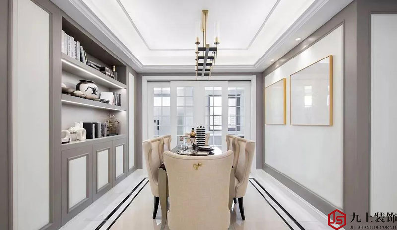 餐廳延續(xù)客廳的風(fēng)格用淺灰與白色的木飾面搭配金色邊框掛畫倒映著每一餐的溫馨時(shí)刻