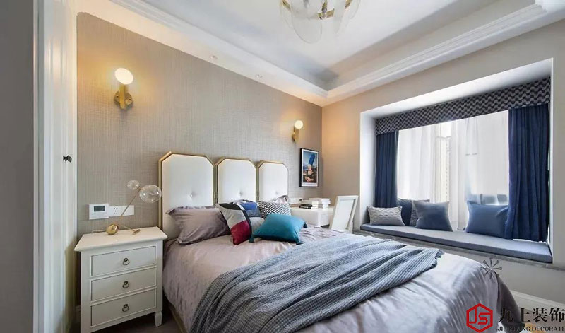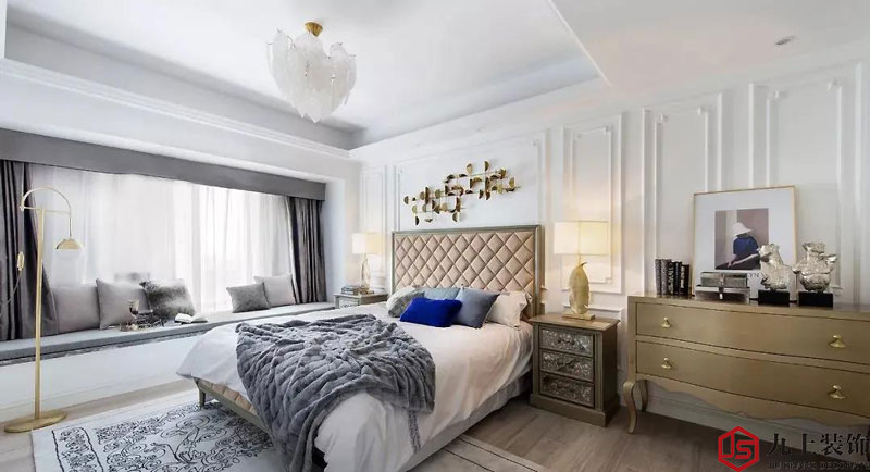 主臥用色整體上更明亮一些配合灰色的布藝窗簾以及隨處可見的金色元素讓空間的色彩層次豐富起來