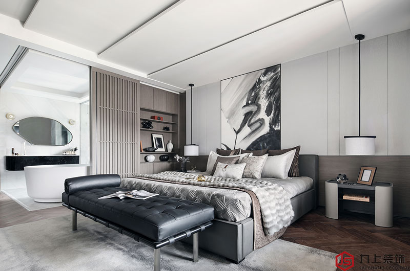 主人房既靜謐又溫馨,設(shè)計考慮獨(dú)處空間的舒適,以低飽和度的灰與橙,呈現(xiàn)主人高雅的氣度。