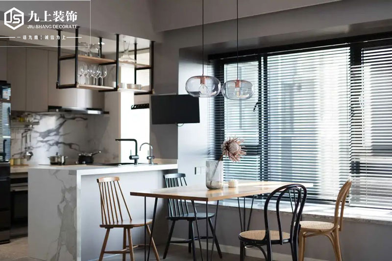 簡(jiǎn)約的線條餐桌椅,鐵藝與木質(zhì)的搭配,工業(yè)風(fēng)下掛式的酒杯架,猶如愜意的咖啡廳文藝且情調(diào)。