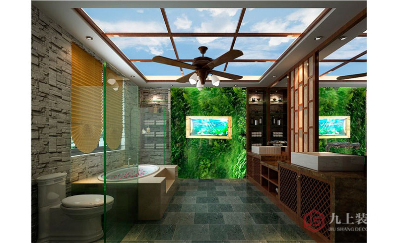 浴室別具一格,實木家具搭配綠色背景墻,仿佛置身熱帶雨林。