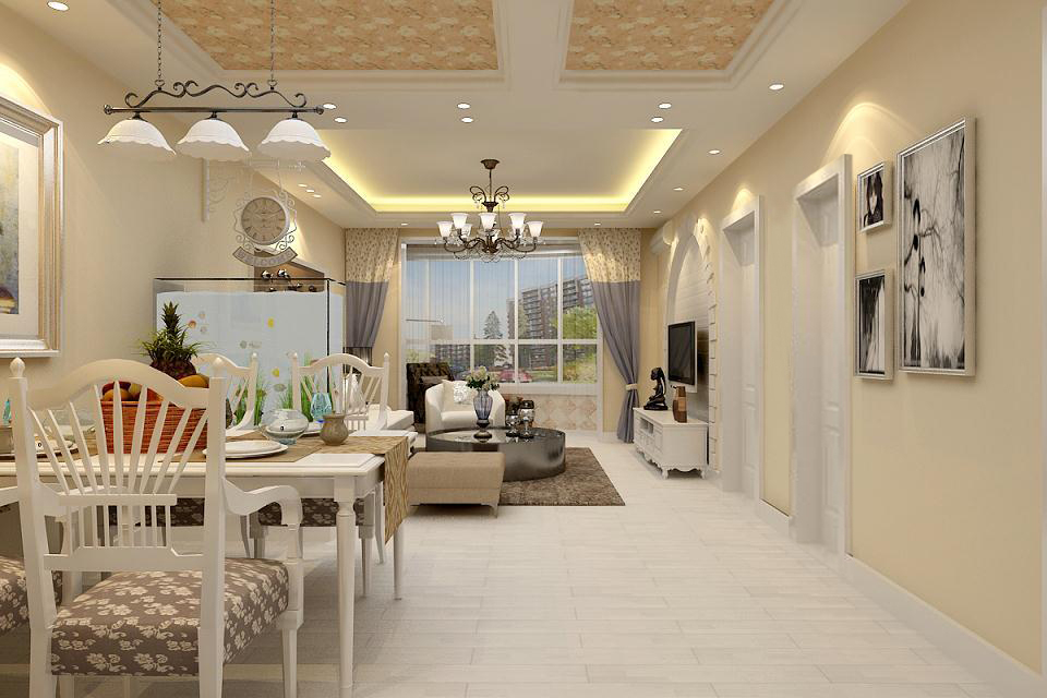 吊頂選擇簡潔的回字型,暖色的燈光,整體在色彩上營造陽光,自然的色彩,魚缸作為軟隔斷,既有分區(qū),有保障了空間的連貫通透