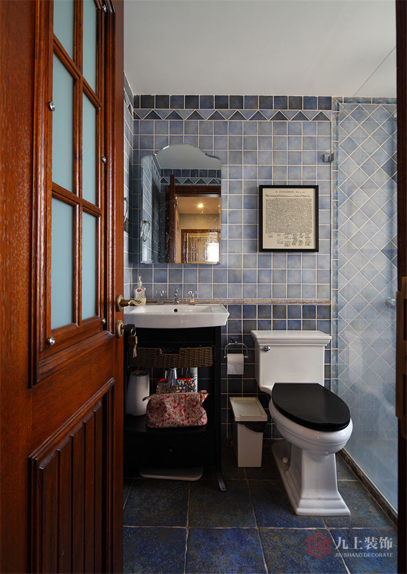實(shí)木門看著更有檔次,不同深淺的灰藍(lán)色瓷磚搭配在一起,很有層次感。