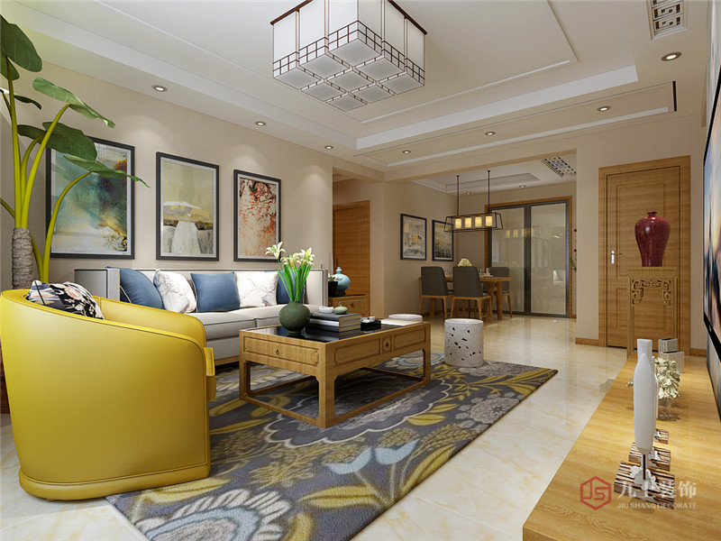 客廳背景墻采用含蓄秀美的中國風壁布,藍色作為主打的顏色與沙發(fā)和地毯的黃色相互呼應,來表達孔雀的秀美,同時體現(xiàn)出主人的高雅情操
