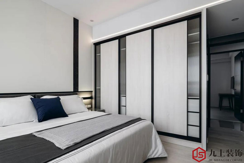 臥室整體輕松舒適的空間,床尾做了一個(gè)較薄的電視柜,延伸到靠窗位置的梳妝臺(tái),呈現(xiàn)出一種現(xiàn)代時(shí)尚的設(shè)計(jì)視覺。臥室的衣柜中間帶著長虹玻璃門,讓柜子的結(jié)構(gòu)更加獨(dú)特時(shí)尚而又實(shí)用。