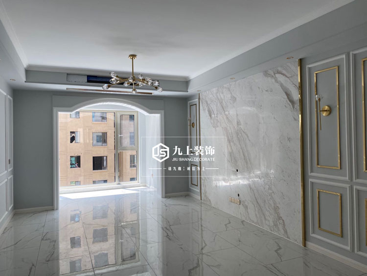 客廳實景完工照-輕奢風格客廳電視背景墻采用石材上墻搭配金屬線條顯得更加柔和溫馨,地磚的紋路使整個空間更加協(xié)調(diào)。
