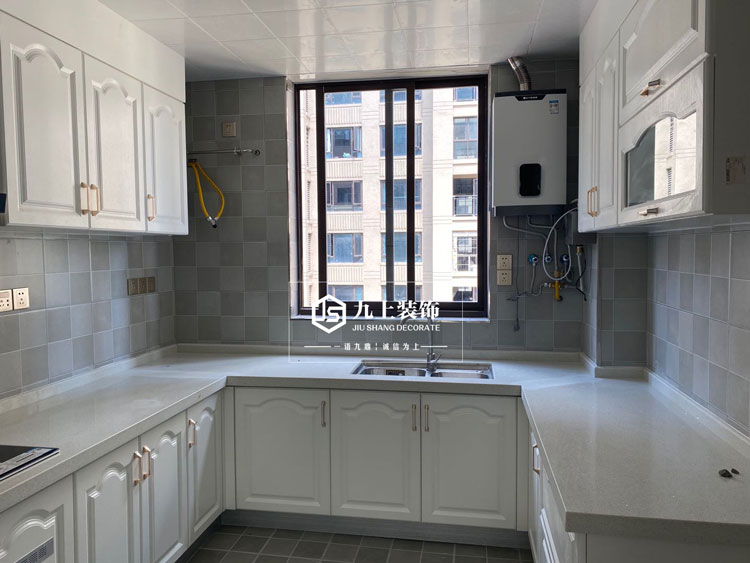 廚房實景完工照-輕奢風格-櫥柜門采用吸塑門板,顏色灰白為主。