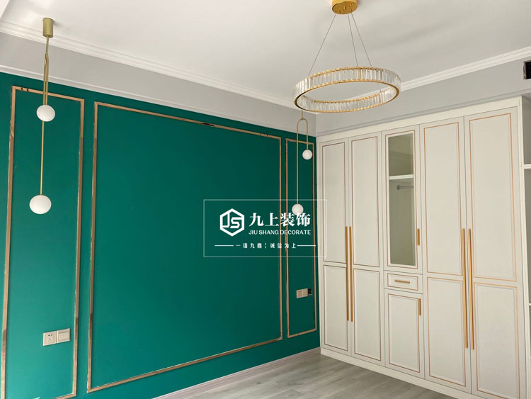 臥室實景完工照-輕奢風格綠色的背景墻讓整個空間有層次感也更加有活力。