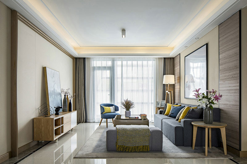 一體化吊頂,天花角線是對(duì)項(xiàng)目訂制成品石膏線,有細(xì)節(jié)感,同時(shí)方便施工,節(jié)省造價(jià)。客餐廳的人性化細(xì)節(jié)主要體現(xiàn)在設(shè)計(jì)師款式的單椅和電視柜上面的高低錯(cuò)落的套組花瓶。