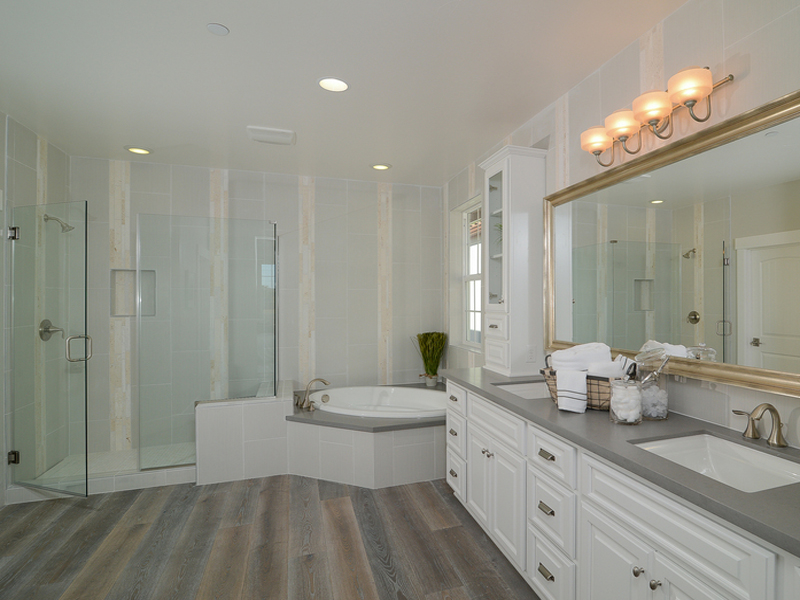 衛(wèi)浴不僅有淋浴房,還有浴缸,想怎么洗都行,可以滿足不同人的需求,白色浴室柜也是很搶眼的。