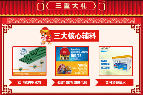 【豪禮三】活動期間簽約業(yè)主尊享三大核心輔料采用歐標純進口材料(歐洲克蘭德水管、美國金貂阻燃電線、英國易頓防水),水電質(zhì)保10年升級至15年,基礎工程終身維護。