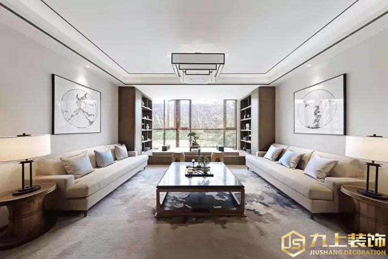 客廳陳列穩(wěn)重簡約的中國式家具,搭配現(xiàn)代布藝沙發(fā),造景以山水屏風(fēng)、陶瓶盆景、燈籠狀的燈具,將禪風(fēng)在新中式空間里演繹。