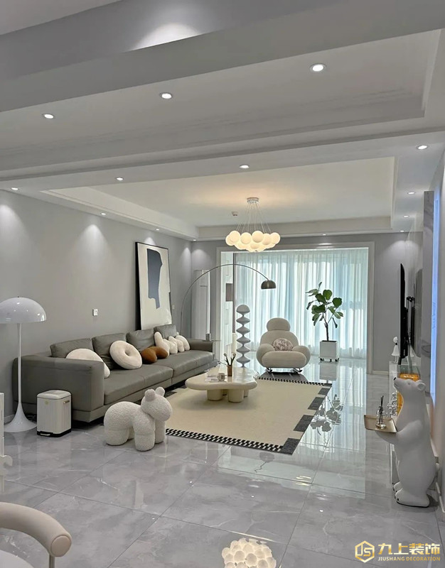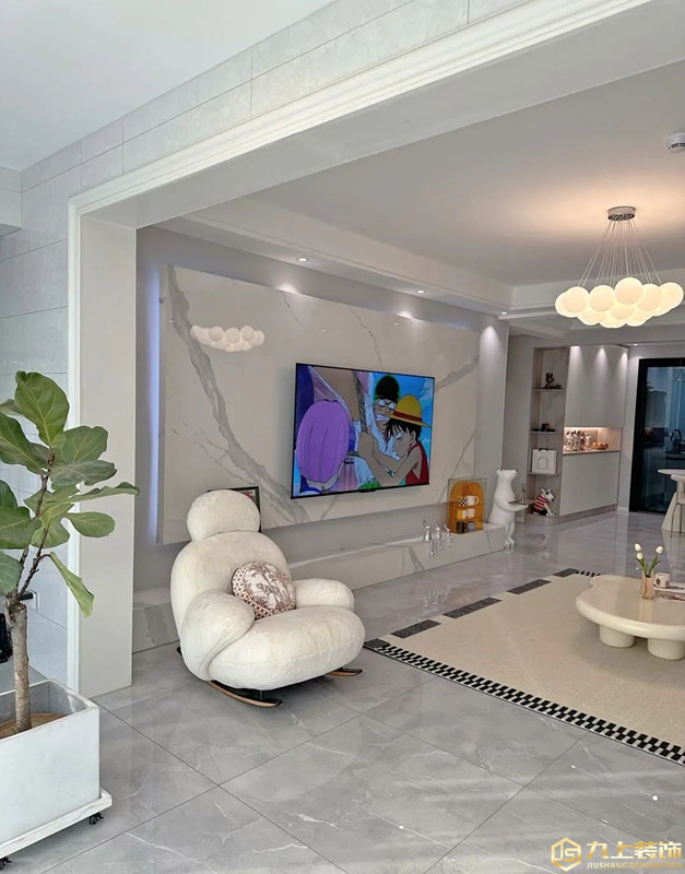 客廳空間簡(jiǎn)約白為主色調(diào),電視墻選擇整面大理石頂部雙眼皮吊頂,簡(jiǎn)約主燈設(shè)計(jì)不壓層高,精致不單調(diào)。