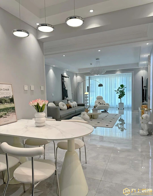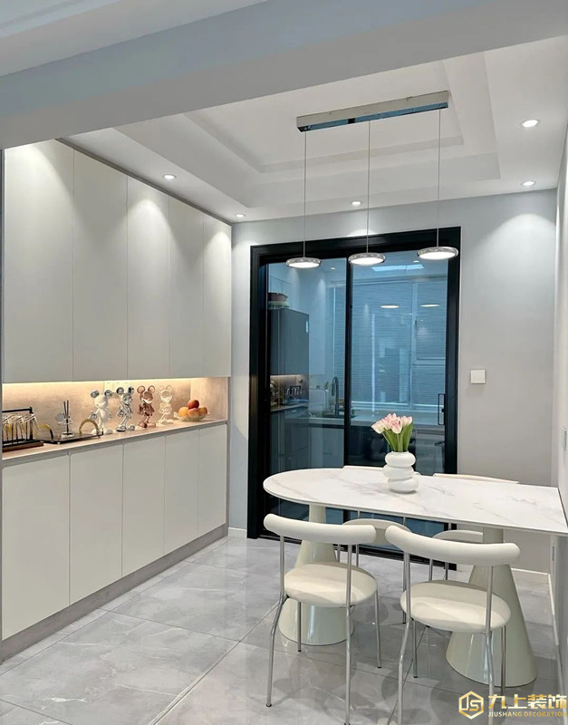 餐廳空間倚靠墻體做餐邊柜,簡(jiǎn)約白餐桌椅搭配精致,還富有豐富的煙火氣。