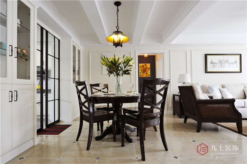 餐桌置于客廳與廚房之間,讓餐廳于無(wú)形中綻放開(kāi)來(lái),讓深棕色的十字餐椅與廚房黑色格子移門(mén)有了形態(tài)上的互動(dòng),舒適討巧
