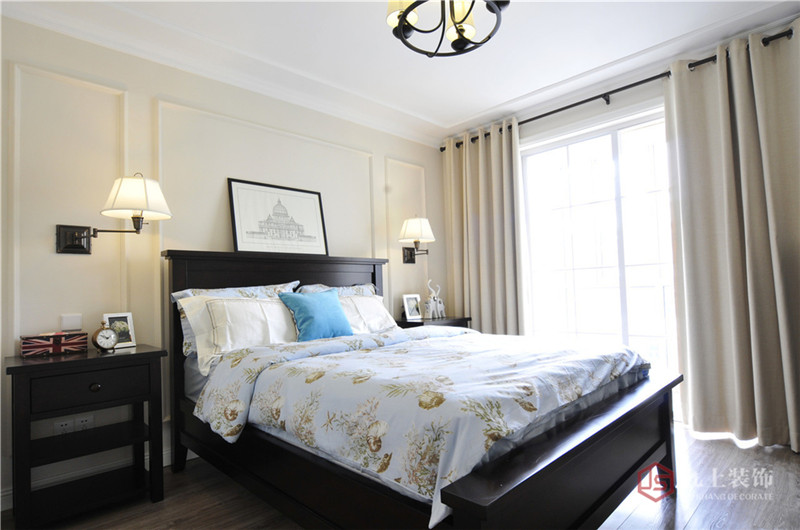 主臥依舊延續(xù)了客餐廳鵝黃與深棕的配搭,立體有型的線條無(wú)處不在,饒有情趣的壁掛式臺(tái)燈靜默成畫(huà),纏纏綿綿