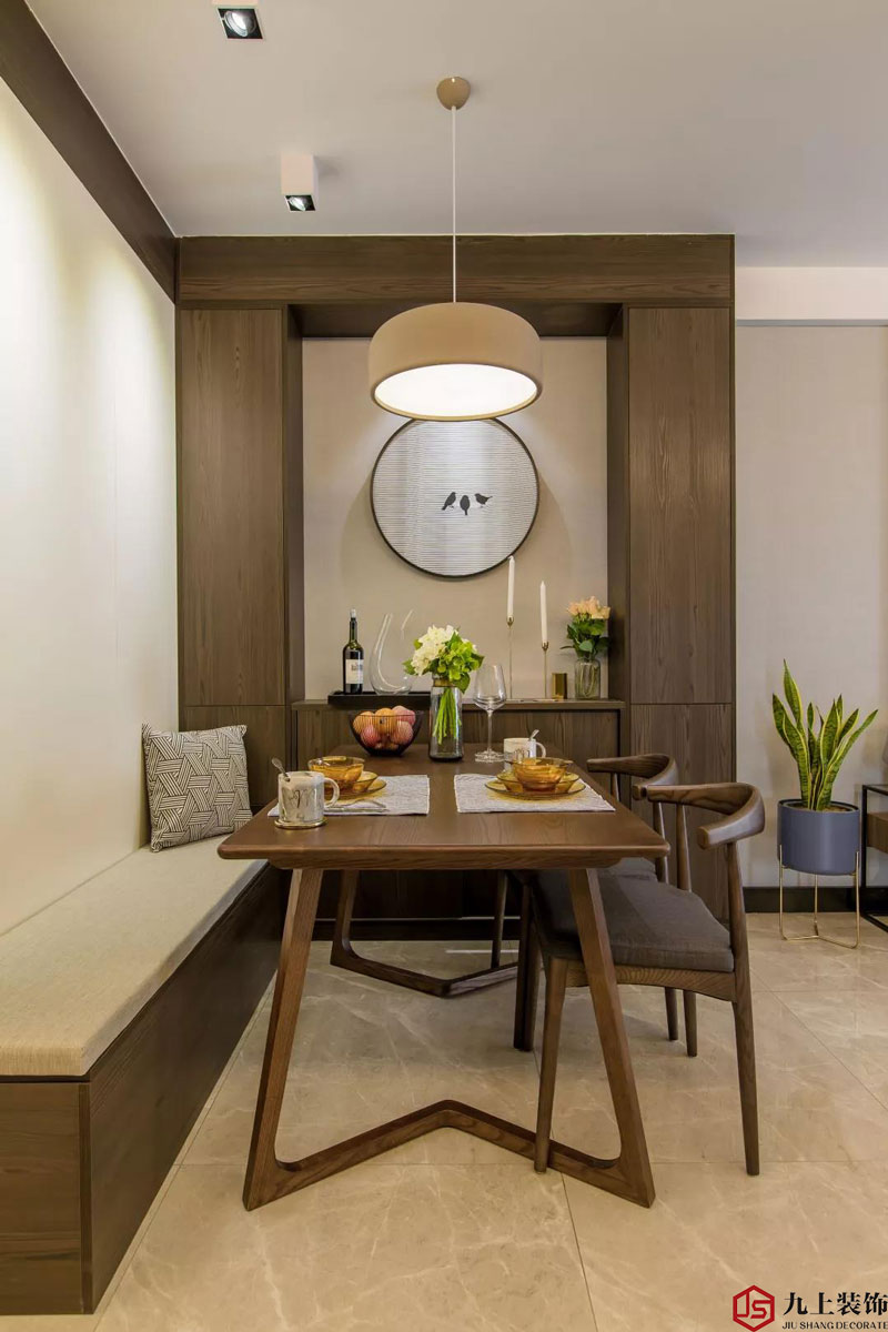 卡座餐廳比較實(shí)用溫馨,質(zhì)感很好的實(shí)木餐桌椅和餐邊柜設(shè)計(jì),反而在吊燈和圓形墻畫(huà)的烘托下,多了一層古典韻味。