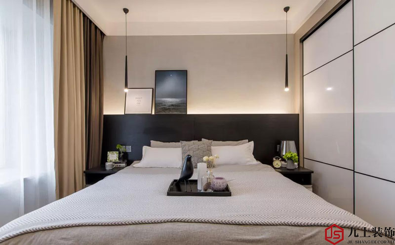 可以看出主臥空間不大,除了一體式背景墻的雙人床,僅剩下一個(gè)白色推拉門(mén)大衣柜,但整體顏色過(guò)渡協(xié)調(diào),風(fēng)格統(tǒng)一,質(zhì)感也延續(xù)的非常巧妙