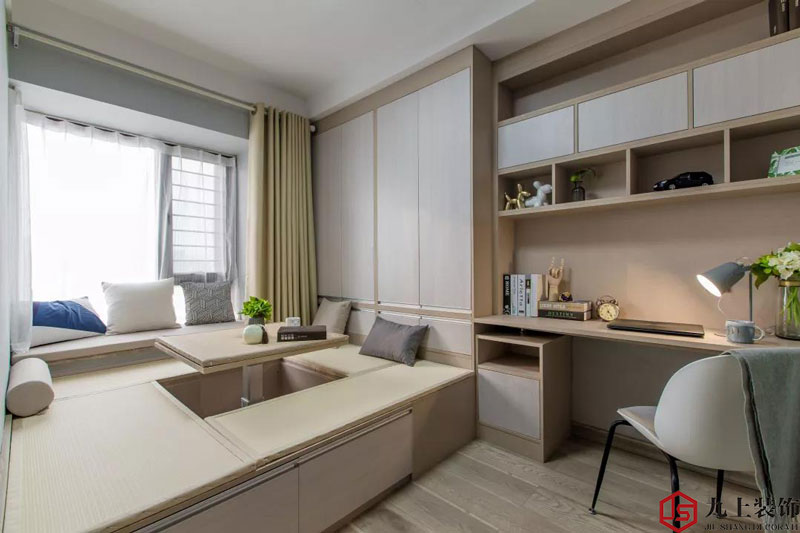 多功能榻榻米房,中間設(shè)計(jì)了一個(gè)上升式方桌,靠窗抬高設(shè)計(jì)了一個(gè)觀景飄窗??繅σ话胱鍪占{柜,另一半留出來(lái)做辦公書(shū)桌和吊柜,設(shè)計(jì)合理實(shí)用,非常棒的多功能房。
