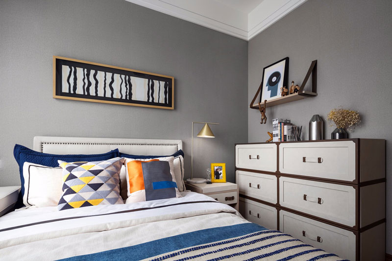 閑適是一種奢侈品,愈豐盛,愈安靜。冰川灰的墻面先行構(gòu)造了一個(gè)內(nèi)斂沉穩(wěn)的氛圍,交錯(cuò)的亮白色和淺古銅的床頭吊燈是空間中兩種極致的搭配裝飾,而穿梭其中那一抹決然不同的夏日橙,靈動(dòng)而鮮明的色彩仿若是在空間跳動(dòng),帶來(lái)的不是風(fēng)格的損毀,而是靈魂的激蕩。