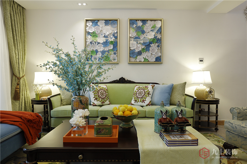 客廳的布藝沙發(fā)、地毯、插花,都透露著濃濃的田園氣息,令人心情放松。