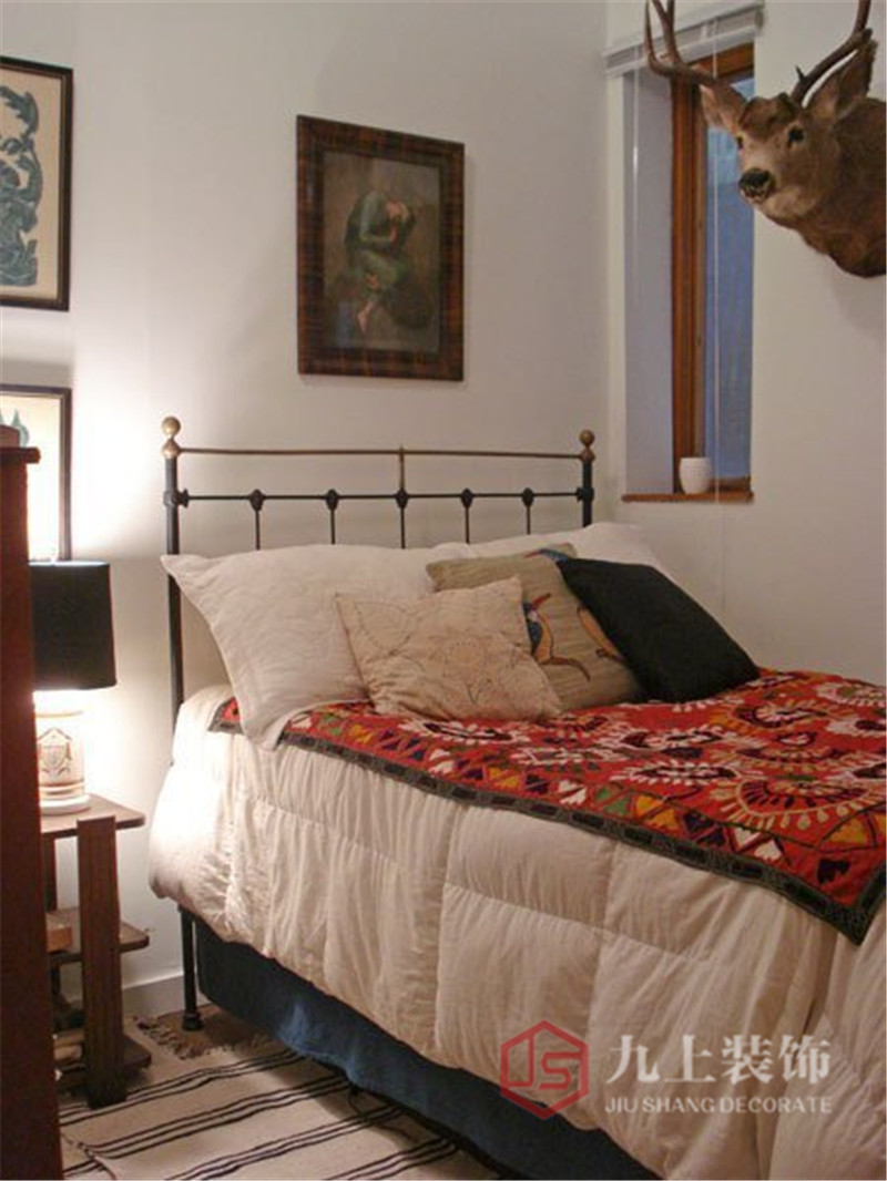 簡單的鐵藝線條勾勒出簡約的床,墻上擺上美式裝飾畫和西部牛頭飾品,仿佛看到當(dāng)年的西部景象