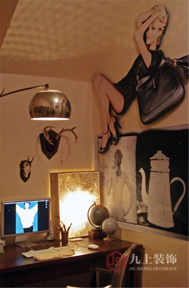 主人對素描、掛畫情有獨鐘,他將時尚和復(fù)古兩種格調(diào)統(tǒng)一到書桌上,通過掛畫、飾品充分展現(xiàn)出來