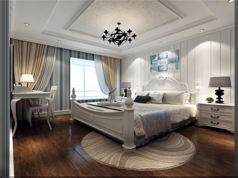 簡單素雅的臥室環(huán)境,地中海式的大床,藍白色的壁紙,置身其中,就像看到了大海,平靜無波。