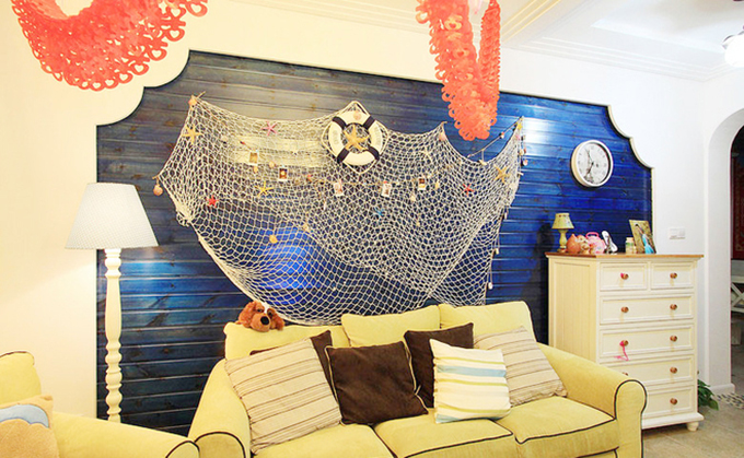 白色的墻體被陽光燈照耀下突出空間溫馨,拱門墻壁配上藍(lán)色的墻面和漁網(wǎng)突顯在大海撲魚場景,黃色沙發(fā)與黃色板式家居體現(xiàn)出大海的晚霞。