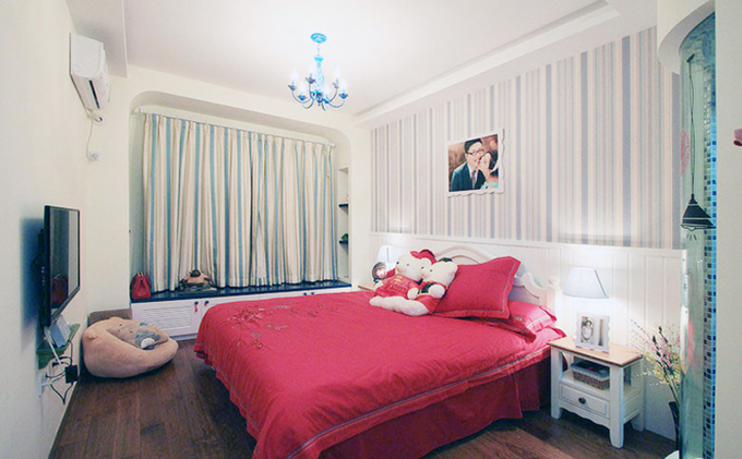 開方式的吊頂配上拱形鐵柱蠟燭吊燈突顯空間大氣,條紋墻面與窗簾融為一體,窗臺榻榻米與家具不僅融為一體還有儲藏柜做到了收納功效。