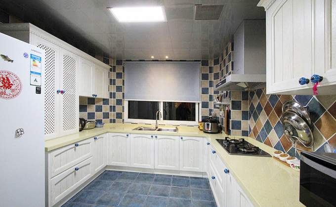 藍(lán)色地磚與天花板對稱,白色櫥柜與黃色的灶面的結(jié)合突顯空間的色彩,多色方塊壁磚配搭上多色多邊形壁磚體現(xiàn)出生活上樸實。