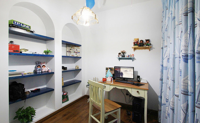 簡約的吊頂配上玻璃罩式吊燈突出空間典雅,拱形門式裝修隔板方可存放書籍和飾品,板式書桌椅與地板融為一體,藍(lán)色船花的窗簾突顯海面寧靜。