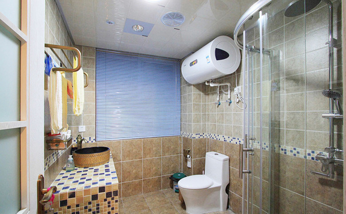 乳白色墻面與白色天花板互相對應(yīng),黃色的地磚配上花式瓷磚的洗臉盆體現(xiàn)空間的色彩,玻璃推拉門存在擁有獨立淋浴間。