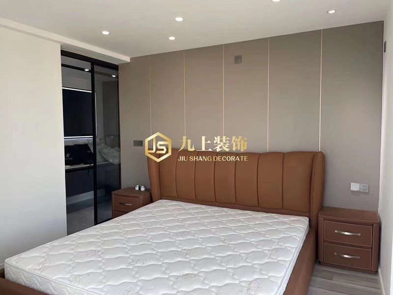臥室也是采用的無主燈設計,棕色的床頭和灰色的墻面柔和的過渡拼接,溫柔和諧