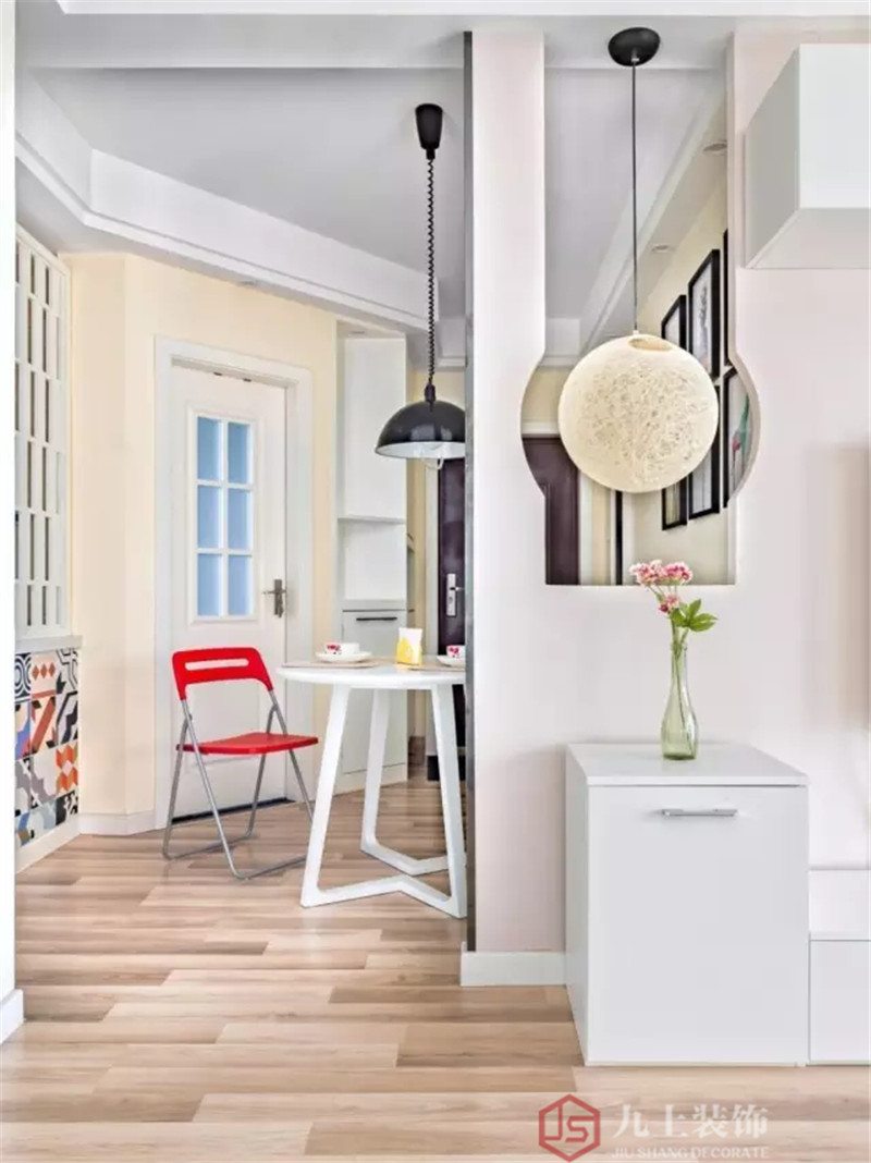 進(jìn)門過道切了廚房的一個角,擴(kuò)大之后變成了小餐廳,隔斷造型和月球燈完美配合