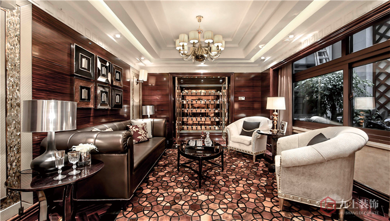 客廳奇特的地板紋路引人注目,每一件裝飾、器物都極具奢華感。