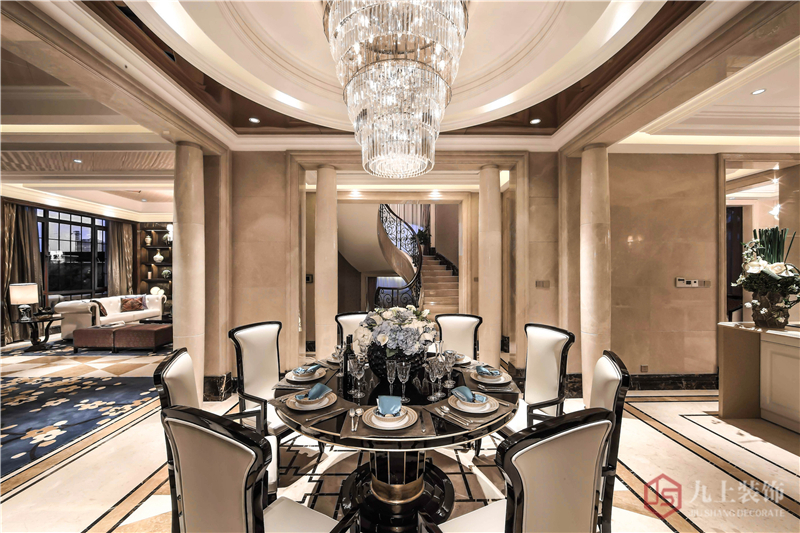 餐廳吊燈奢華,餐桌、餐椅和樓梯的設(shè)計也十分搭配。