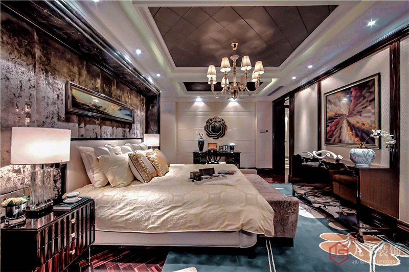 臥室的掛畫都很有質(zhì)感與立體感,地板的鋪設(shè)也很藝術(shù),地毯高雅別致。