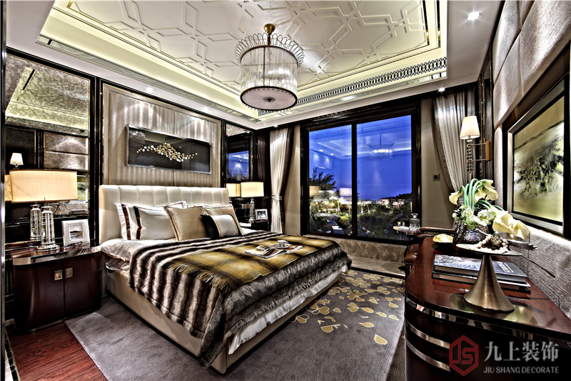 臥室天花板也有大型燈池,房間里的搭配看起來高端奢華。