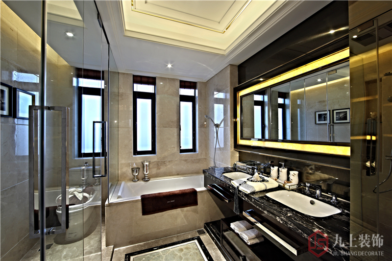 浴室以黑色和淺色為主,顏色深淺搭配,有層次感。