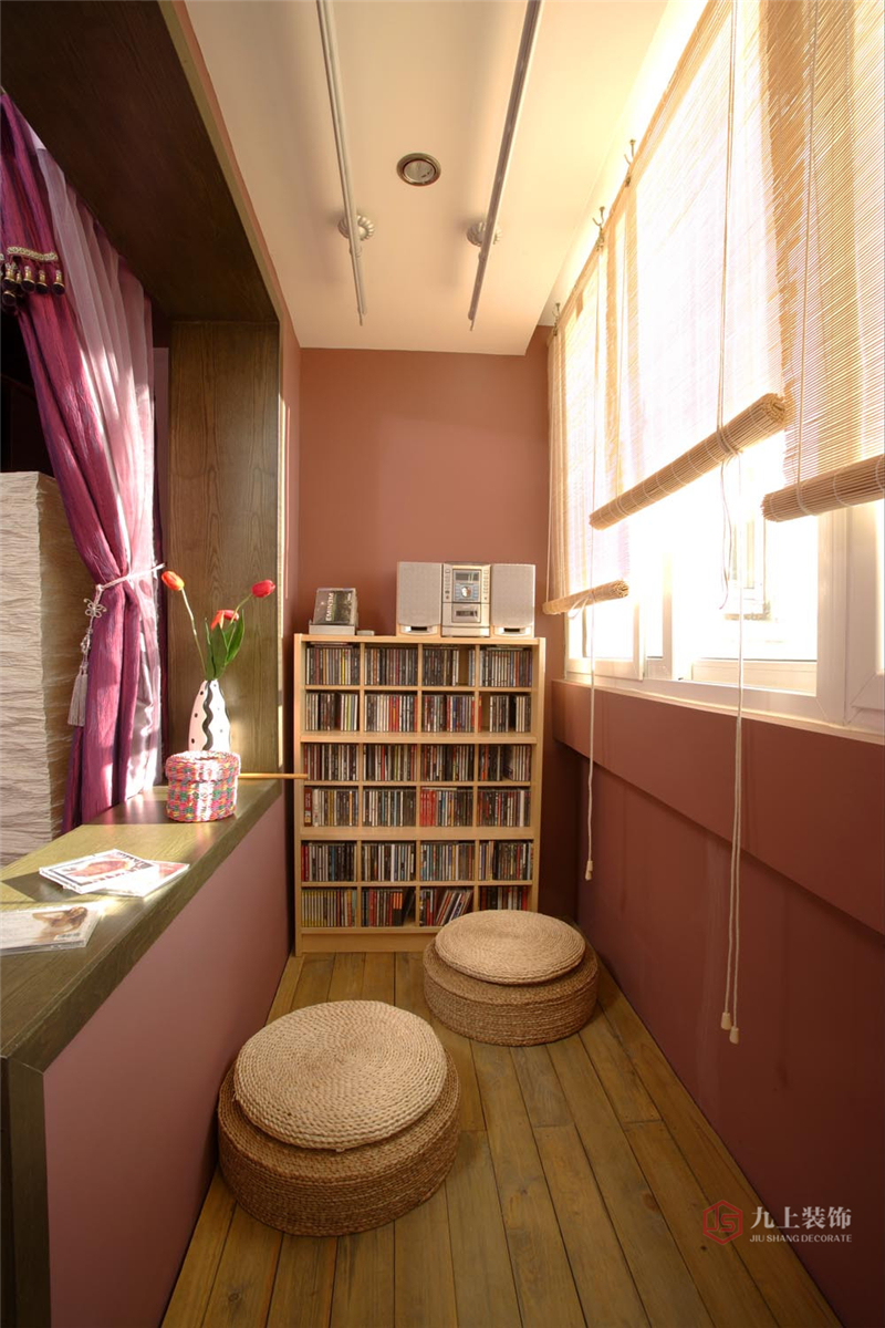 陽(yáng)臺(tái)改造成了私密性極高的書(shū)房,暖暖的陽(yáng)光,以及淺色的書(shū)架和地板,尤其手工榻榻米坐墊,使環(huán)境舒適悠閑。