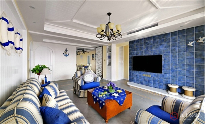 客廳家具以藍色+白色為主,電視墻采用灰藍色的瓷磚,好似汪洋大海,海上還有兩只白色的海鷗。