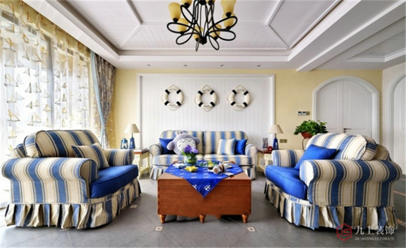 沙發(fā)背后的墻面采用淺黃色乳膠漆,墻中間用白色做局部造型,掛上三個救生圈,與地中海主題相輝映。