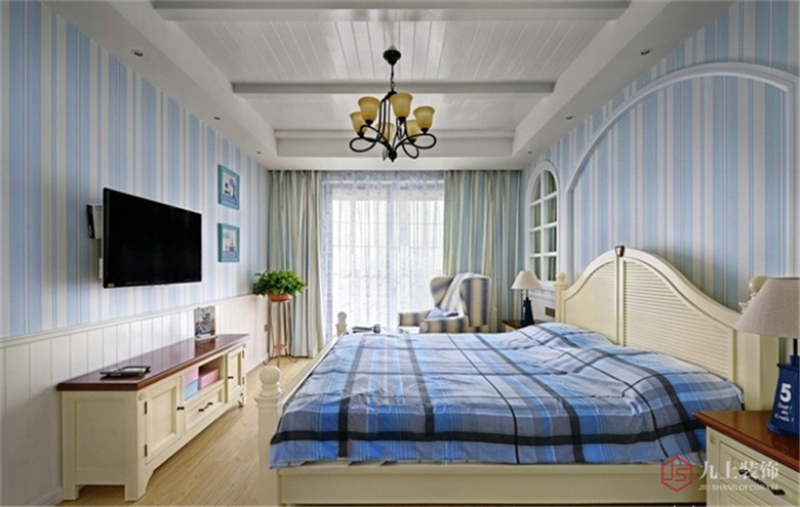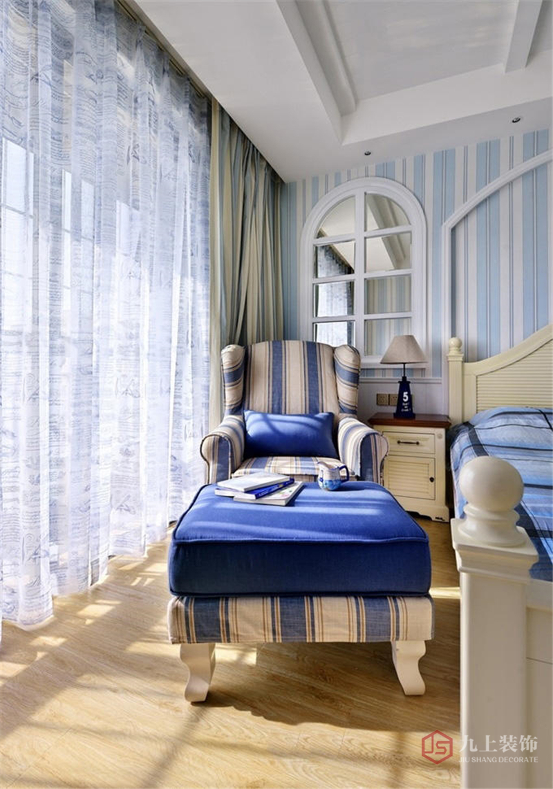 陽臺邊的沙發(fā)椅和沙發(fā)凳與床上用品的顏色也十分搭配。床頭柜上方的鏡子做成拱形窗戶的樣式,具有地中海風情。