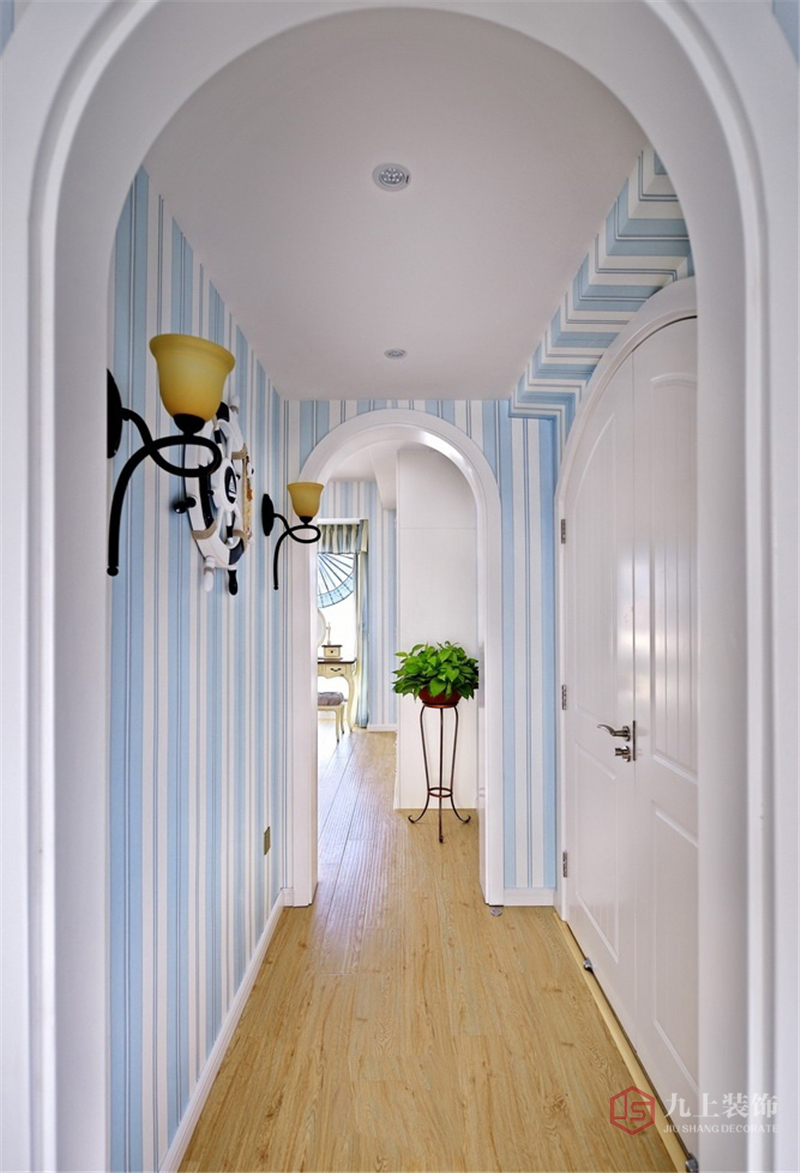 QQ咨詢:“地中海風格”對中國城市家居的最大魅力,來自其純美的色彩組合。這套裝修案例顏色以藍與白為主,在裝飾方面融入了多種海洋元素,還有弧形鏡子和拱形門的應用,極具地中海特色。