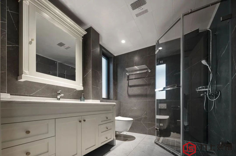 淺色地磚搭配深色墻磚,時(shí)尚質(zhì)感不顯壓抑,超大衛(wèi)浴柜,可容納所有清潔洗漱用品。