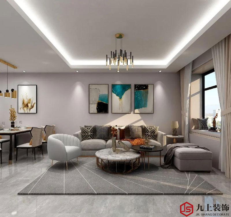 QQ咨詢:客廳的色調(diào)搭配比較柔和,突顯冷淡感的同時又散發(fā)著韻味,靠墻位置擺放了一個灰色雙人沙發(fā),加上墻上掛畫以及奶白色的墻面,簡單的畫面卻有別致的美感。