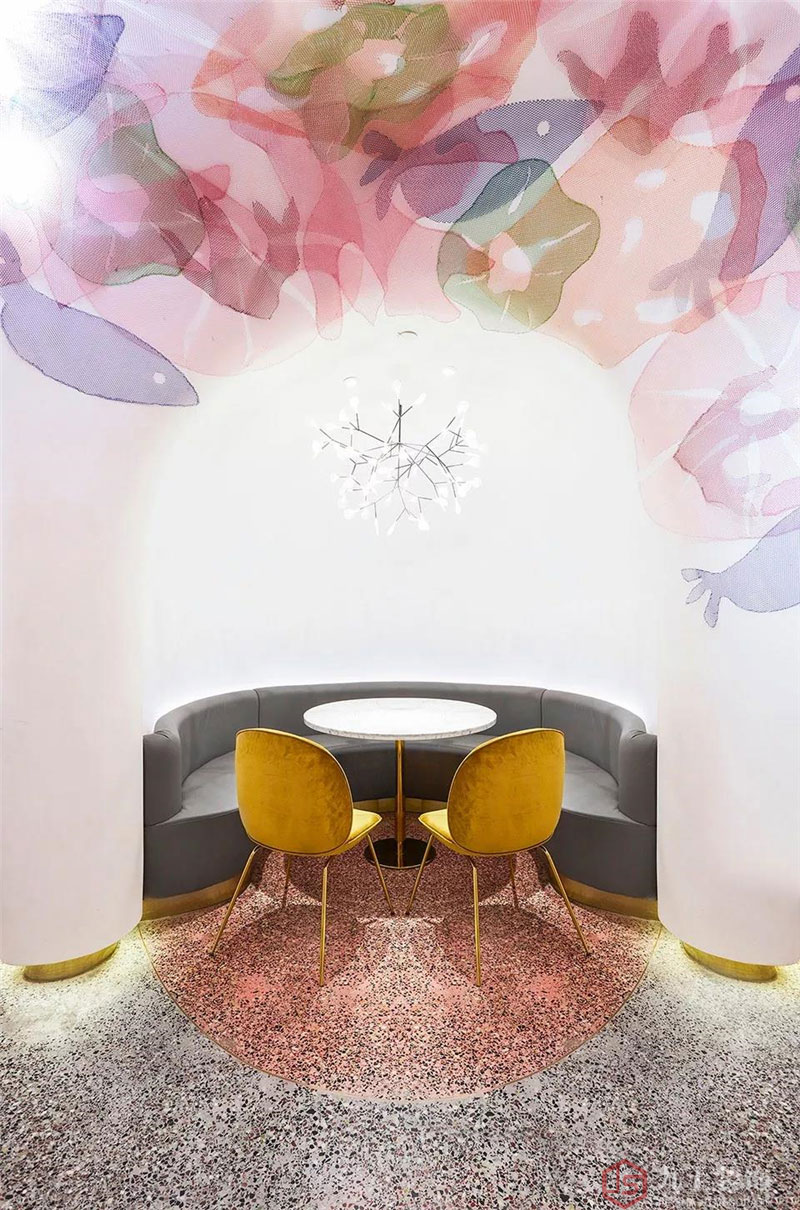 我們以清透的白為基底,藍(lán)與粉等色彩交織的金屬網(wǎng)從頂部天花向下延伸,營(yíng)造整體充滿(mǎn)夢(mèng)幻與流動(dòng)感的水下世界。