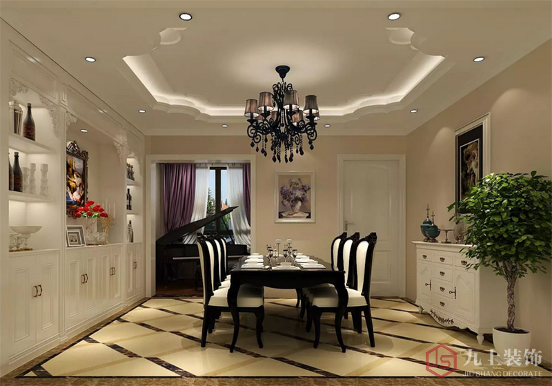 整個(gè)餐廳吊頂?shù)脑O(shè)計(jì),裝飾感非常強(qiáng)烈。地面磚拼花的設(shè)計(jì)則給人視覺(jué)享受。